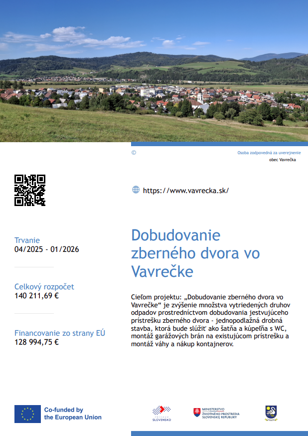 Cieľom projektu: „Dobudovanie zberného dvora vo Vavrečke“ je zvýšenie množstva vytriedených druhov odpadov prostredníctvom dobudovania jestvujúceho prístrešku zberného dvora - jednopodlažná drobná stavba, ktorá bude slúžiť ako šatňa a kúpeľňa s WC, montáž garážových brán na existujúcom prístrešku a montáž váhy a nákup kontajnerov.