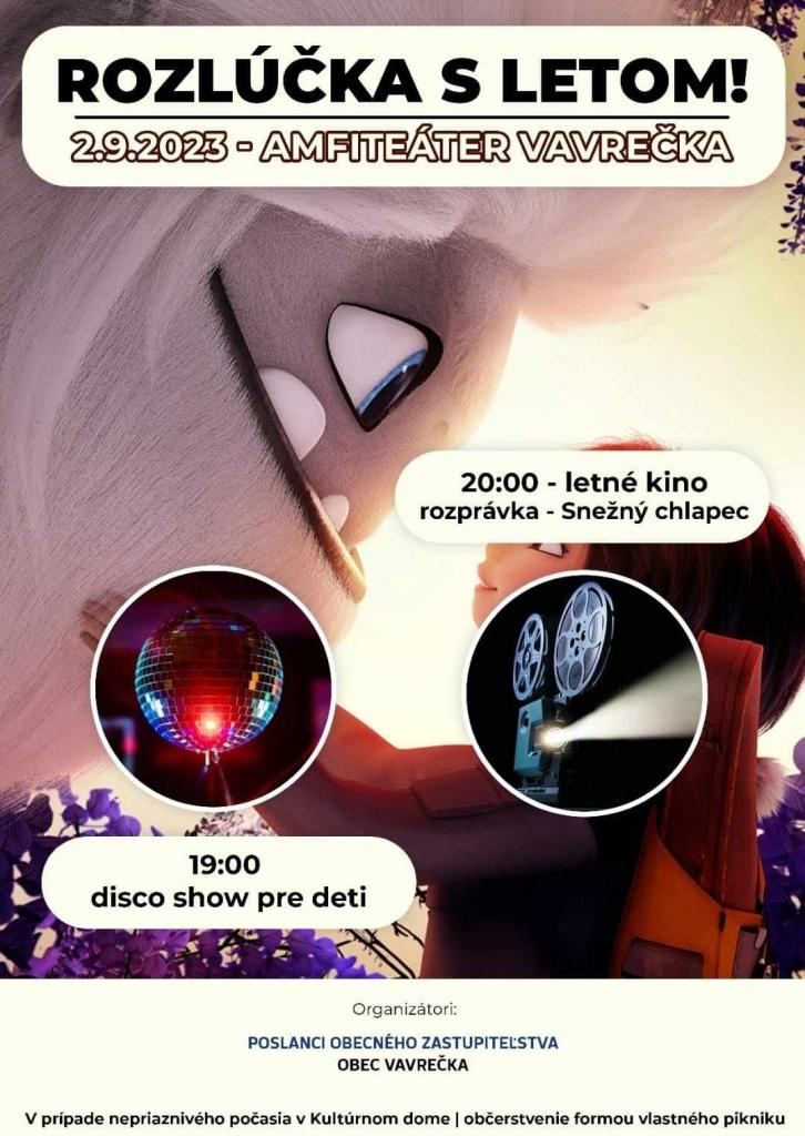 Obec Vavrečka a poslanci Obecného zastupiteľstva pozývajú deti: Rozlúčka s letom - 2.9.2023, amfiteáter Vavrečka 19:00 - disco show pre deti 20:00 - letné kino: SNEŽNÝ CHLAPEC