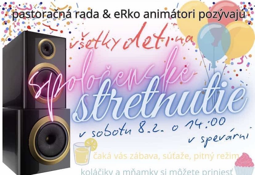 Pastoračná rada a eRko animátori pozývajú všetky deti na stretnutie, ktoré sa uskutoční v sobotu 08.02.2025 o 14:00 hod. v spevárni.